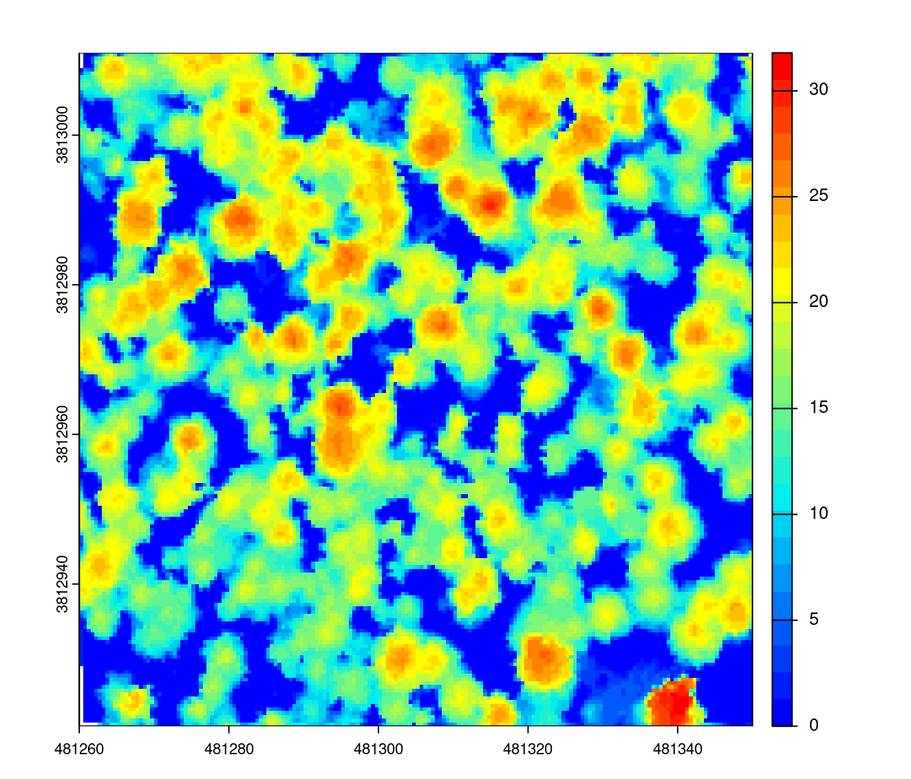 chm <- rasterize_canopy(las, res = 0.5, algorithm = p2r())