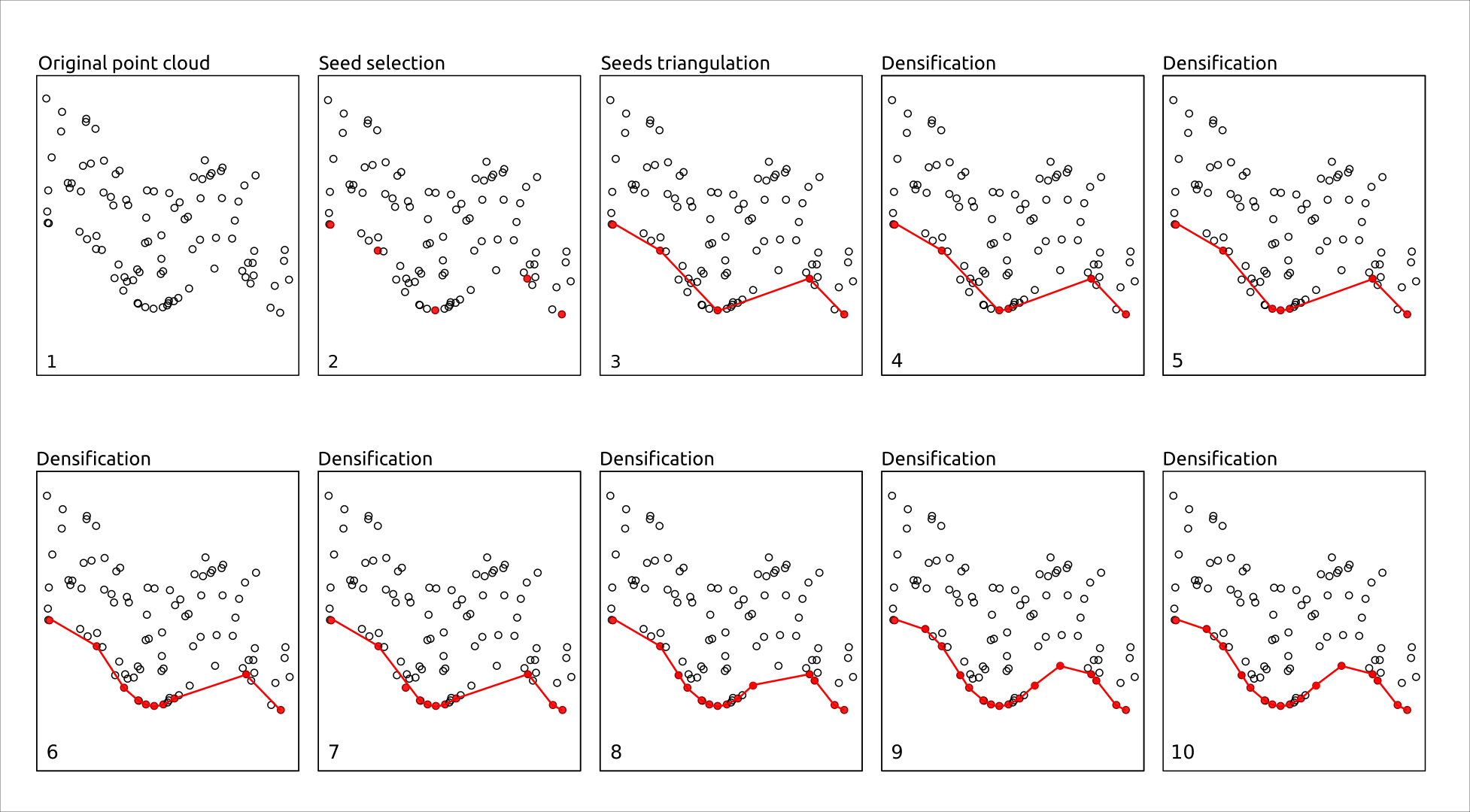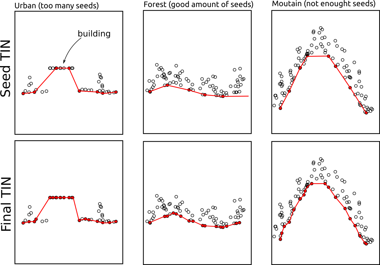PTD starts with a small set of points that are very likely to be on the ground (called seeds), usually the lowest points in the area, and uses them to create an initial Triangulated Irregular Network (TIN). Then, other points are tested one by one and added to the TIN if they fit the shape of the current surface, based on simple rules such as maximum slope or height difference with the current TIN. Points that are too high or that create sharp angles are rejected as non-ground objects (trees, buildings, etc.). By progressively adding only compatible points, the TIN gradually adapts to the true terrain, producing a reliable ground model even in complex landscapes.