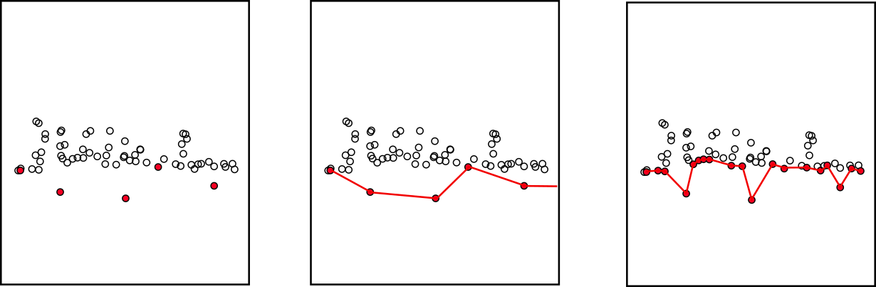las <- classify_ground(las, ptd(20))PTD starts by selecting seeds. A seed is the lowest point found within each cell of a grid with resolution res. This parameter is very important because all seeds must be actual ground points. If some seeds are not ground points, the final classification will be incorrect (some low noise points are tolerated; see later). The resolution must be chosen large enough so that the lowest point in each cell is actually a ground point and not, for example, a rooftop or a tree (see figure below). At the same time, we want to have as many seeds as possible to capture steep variations in the terrain. If the seeds are too widely spaced, PTD may miss and truncate some mountain tops (see figure below).