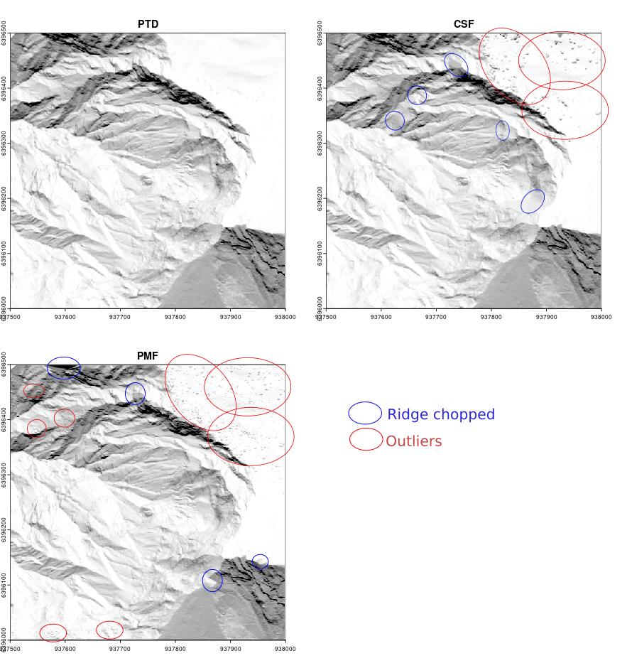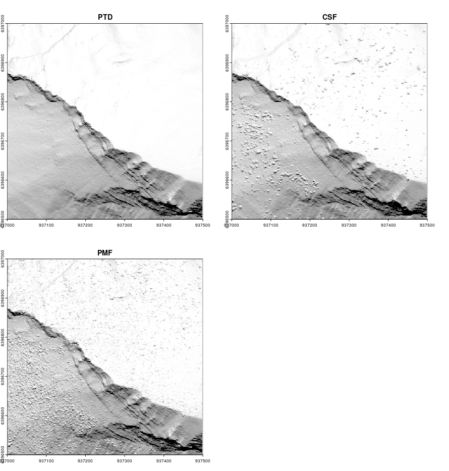 See Chapter 5 to learn how to build a DTM. Below are the results of the best ground classifications and DTMs we were able to achieve with CSF, PMF, and PTD in a complex mountainous scene with sharp ridges and steep slopes. Although the images are rendered small in this book, we can observe that ridges and slopes are better classified with PTD and that PTD does not produce the numerous bumps caused by outlier misclassification in vegetated areas, which often result from overly permissive parameter settings required to handle such complex scenes.